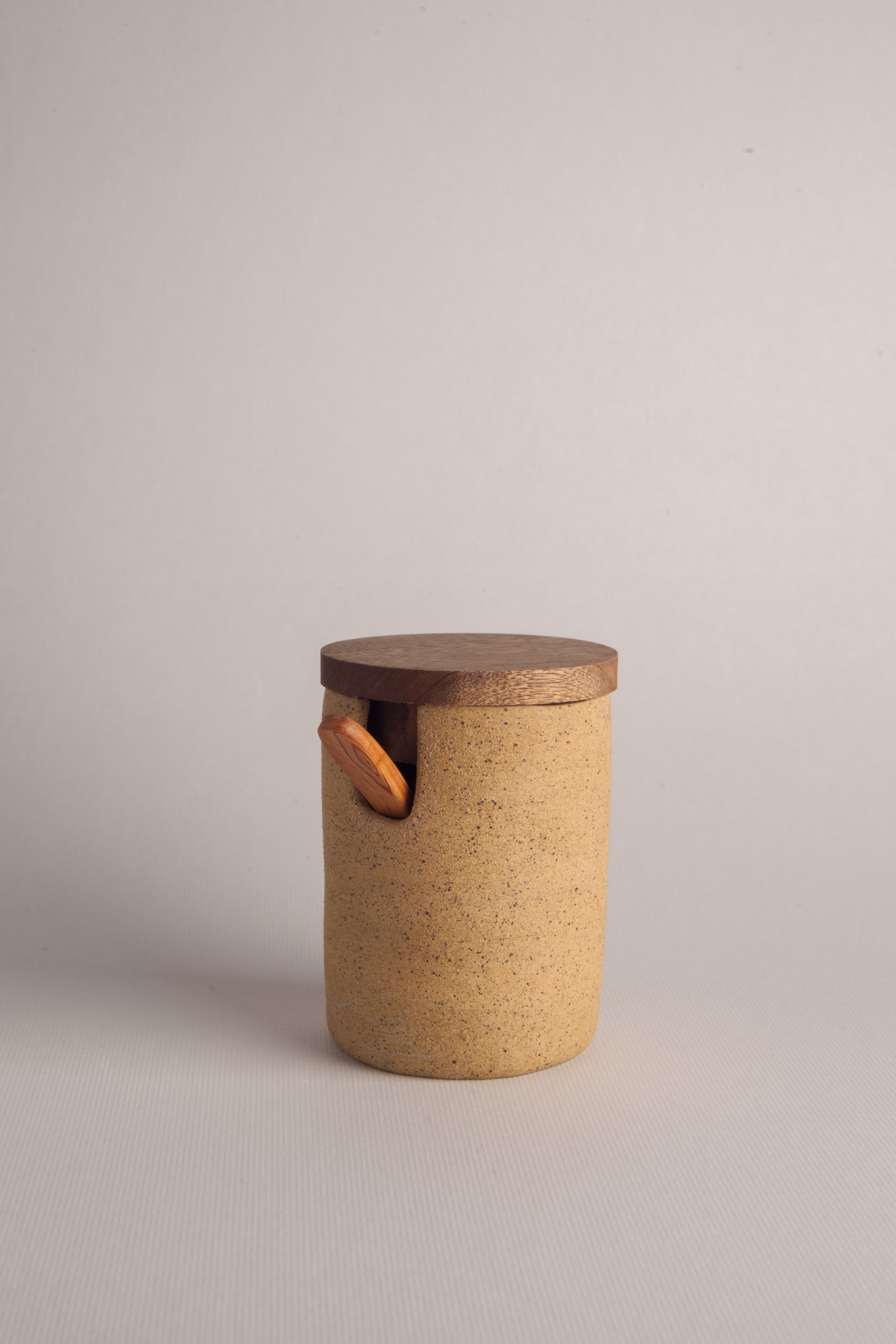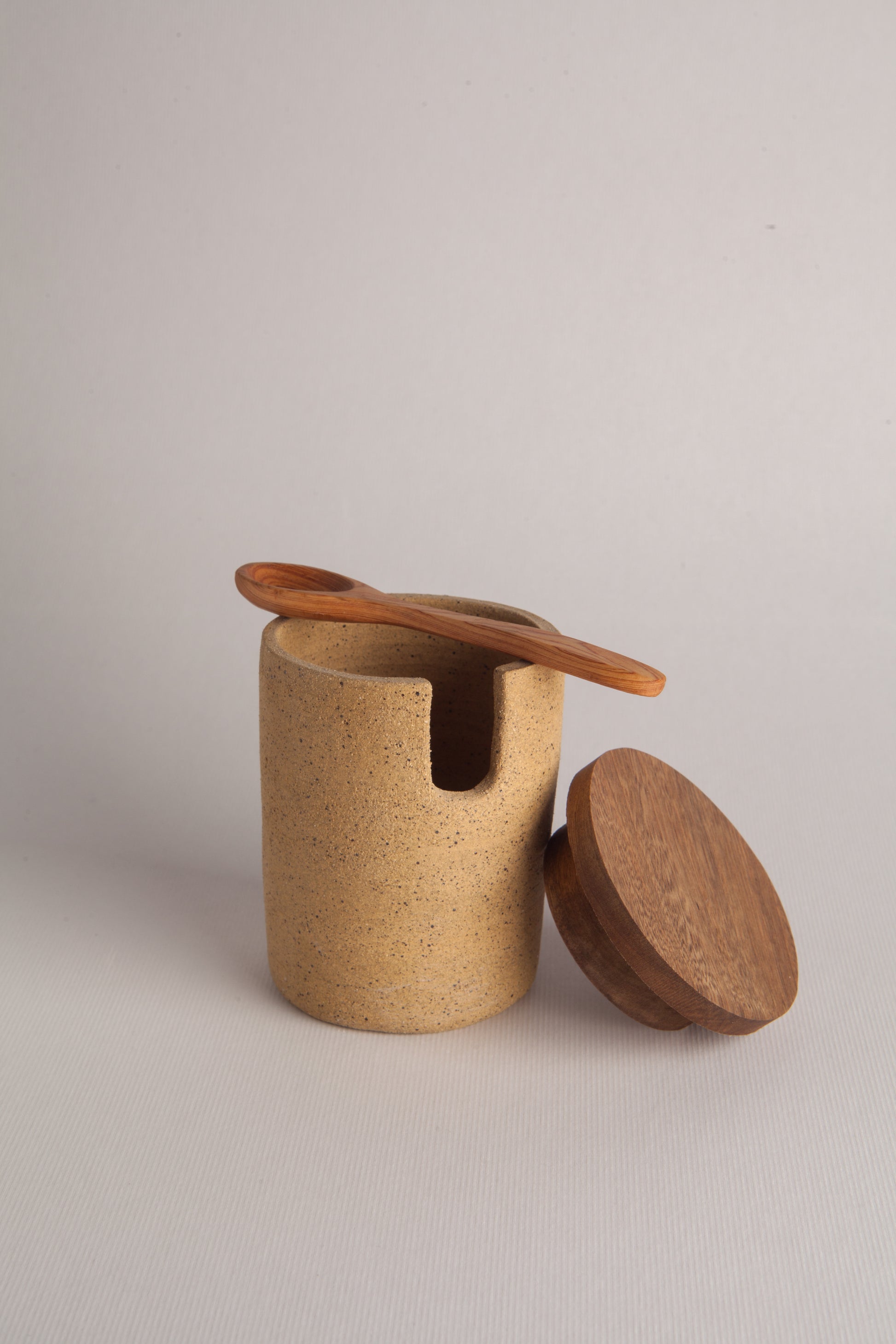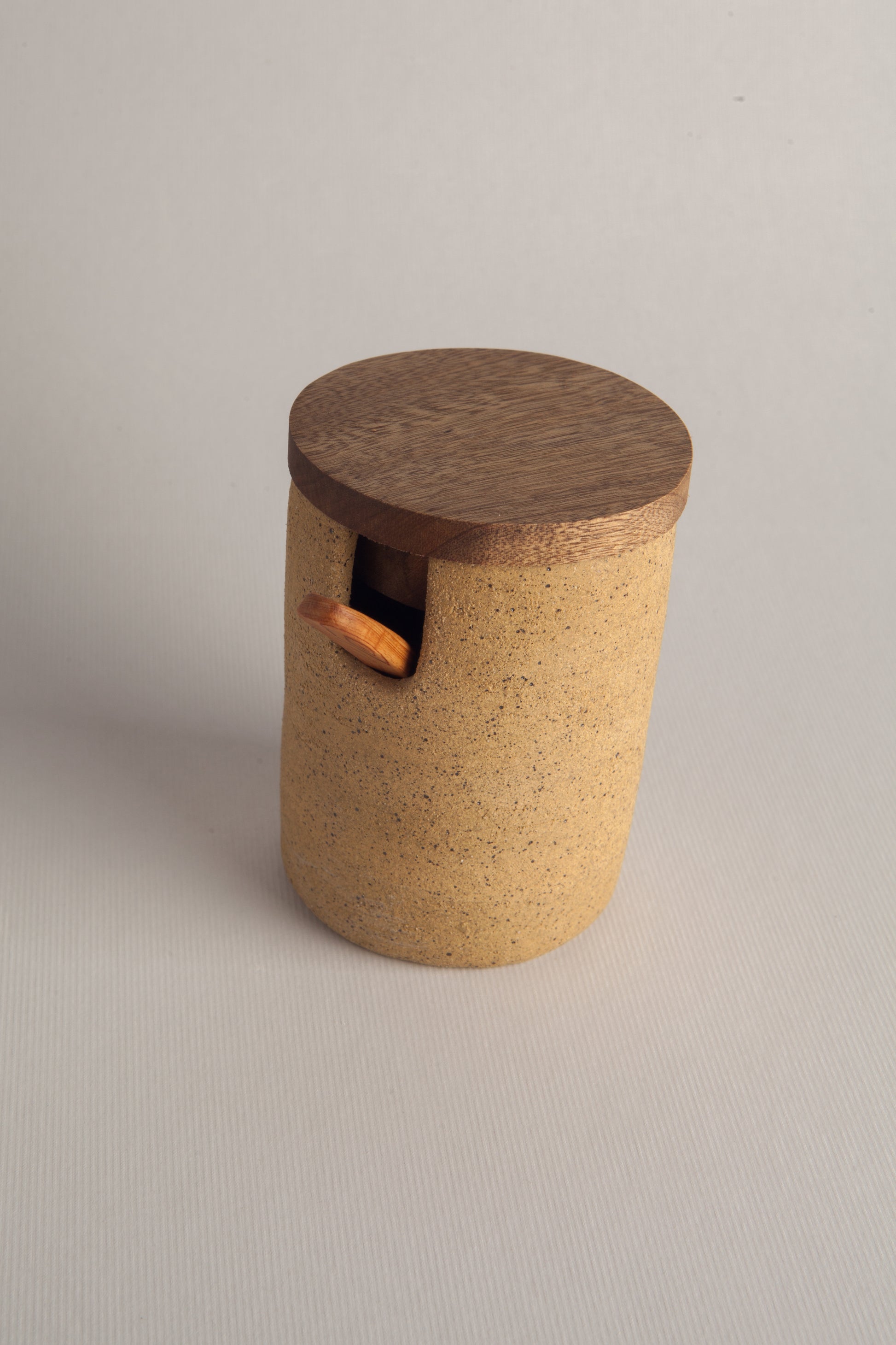 Especiero hecho en cerámica de alta temperatura con tapa y cuchara en madera sólida de roble.